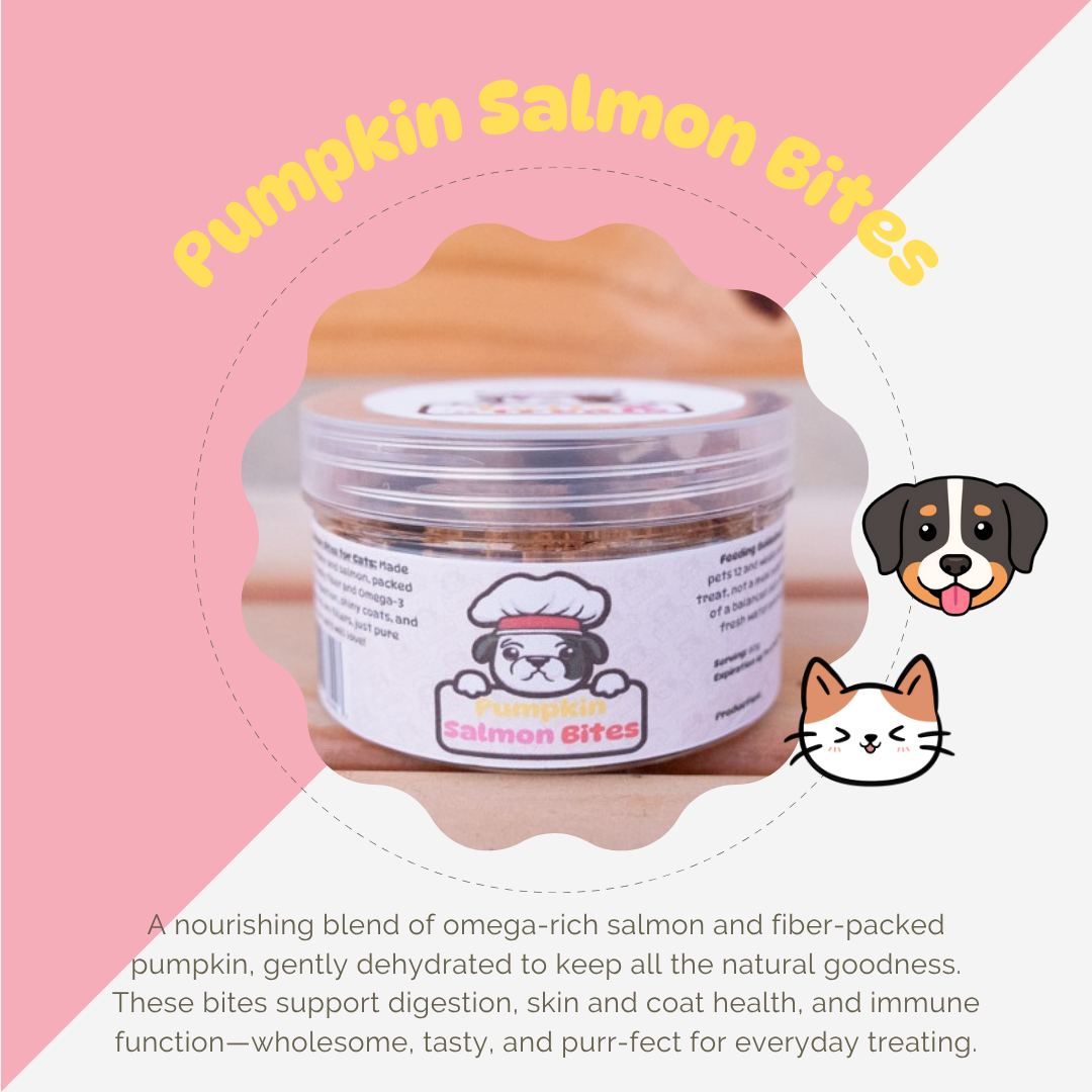 A nourishing blend of omega-rich salmon and fiber-packed pumpkin, gently dehydrated to keep all the natural goodness. These bites support digestion, skin and coat health, and immune function—wholesome, tasty, and purr-fect for everyday treating.